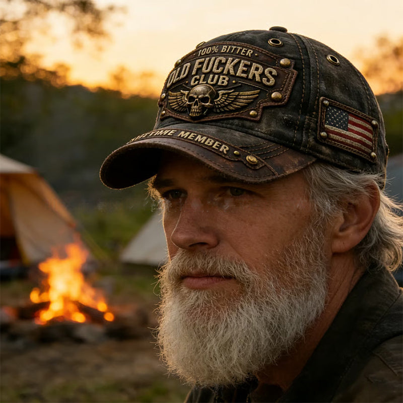 AUSGEFALLENE VINTAGE-STICKEREI – Zeigen Sie Ihre Erfahrung mit Aufnähern mit den Aufschriften „OLD FUCKERS CLUB”, „100 % BITTER” und „LIFETIME MEMBER”. Diese Kappe ist ein Ehrenabzeichen, das ein erfülltes Leben mit einem kompromisslosen, robusten Stil feiert.